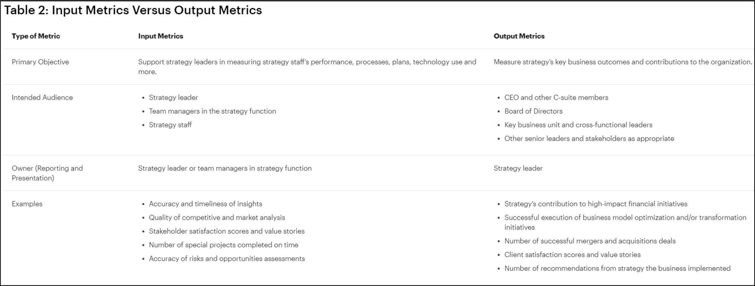 - Input metrics measure internal activities, such as the number of strategic initiatives supported, completion of key deliverables, or engagement levels in strategy discussions.