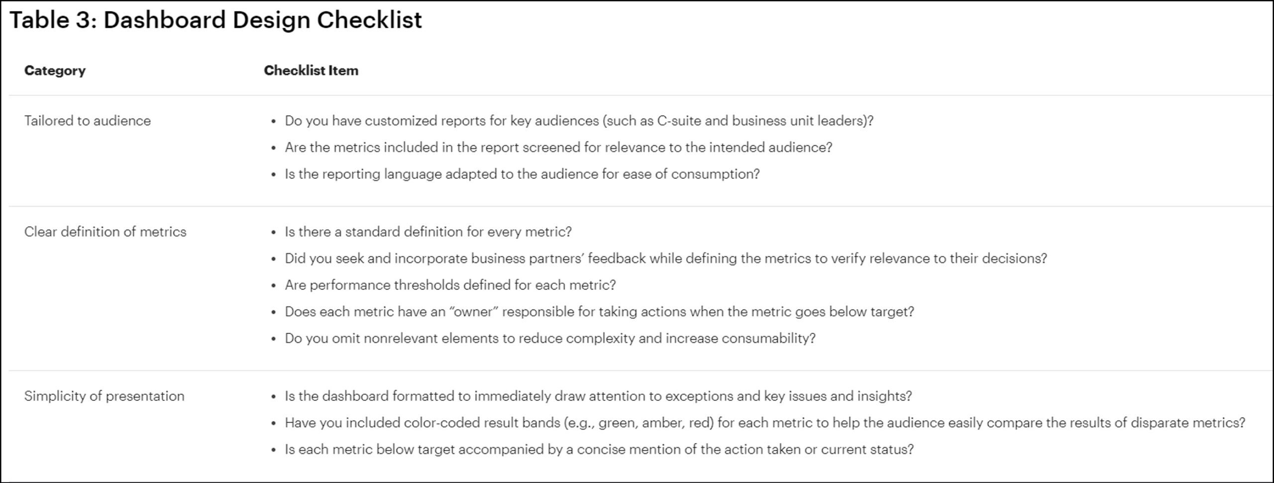 Table 3 provides a Dashboard Design Checklist that you can use to develop an effective dashboard.